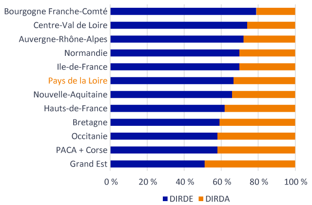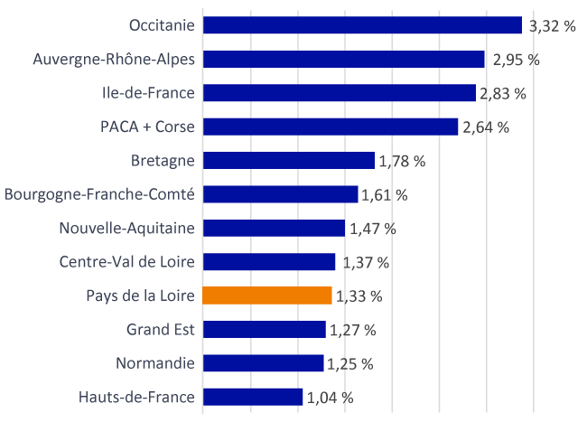 En Pays de la Loire, 67 % des dépenses de R&D sont effectuées par des entreprises du domaine privé. La région se classe ainsi au 6e rang des régions françaises derrière l’Ile-de-France et devant la Nouvelle-Aquitaine.