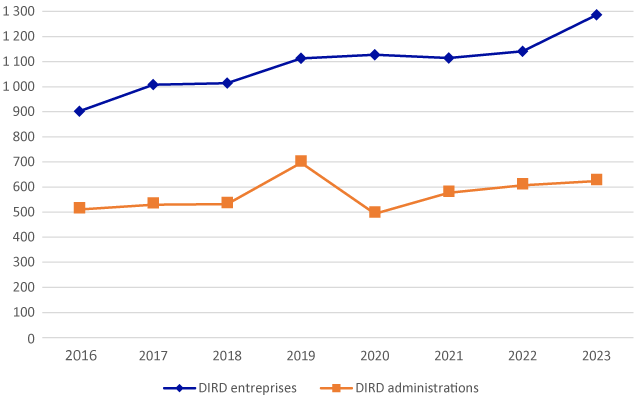 La dépense intérieure de recherche & développement (DIRD) correspond aux sommes engagées pour réaliser les travaux de R&D sur le territoire quelle que soit l’origine des fonds. Cette dépense, effectuée par les entreprises (DIRDE) ou par le secteur public (DIRDA), se compose de deux volets :