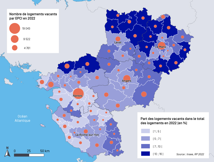 Avec 133 371 logements inoccupés, les Pays de la Loire présentent un taux de vacance de 6,3 %, parmi les plus faibles de France, avec la Corse (3,3 %), la Bretagne (6,8 %) et l’Île-de-France (7,1 %). Le taux de vacance atteint 7,9 % en France métropolitaine. En Pays de la Loire, cette inoccupation modérée du parc peut traduire une tension sur certains marchés locaux (métropoles régionales et périphéries, littoral, etc.), où la demande est forte au regard de l’offre disponible. Le poids plus important de l’accession à la propriété en région, induisant une moindre fréquence des rotations, et l’ancienneté plus faible du parc de logements ligériens, en Vendée et Loire-Atlantique, sont également des explications possibles.