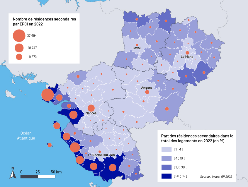 La région compte par ailleurs près de 222 000 résidences secondaires, représentant 10,5 % du parc de logements, taux supérieur à la moyenne nationale. En Pays de la Loire, les départements de la Loire-Atlantique et de la Vendée sont ceux qui abritent la plus forte proportion de résidences secondaires, essentiellement le long de la côte Atlantique. 23,4 % des logements de Vendée sont des résidences secondaires, soit près de la moitié de l’ensemble régional (47,2 %). Dans certains EPCI, le nombre de résidences secondaires excède même celui des résidences principales, en particulier sur les îles de Noirmoutier (68,6 %) et d’Yeu (60,2 %) ou bien encore dans la CC Océan Marais de Monts (56,6 %). Plus globalement en Pays de la Loire, la présence des résidences secondaires est plus marquée au nord de la Mayenne et le long de la frontière est de la région, principalement en Sarthe, du fait de la proximité de la région parisienne.